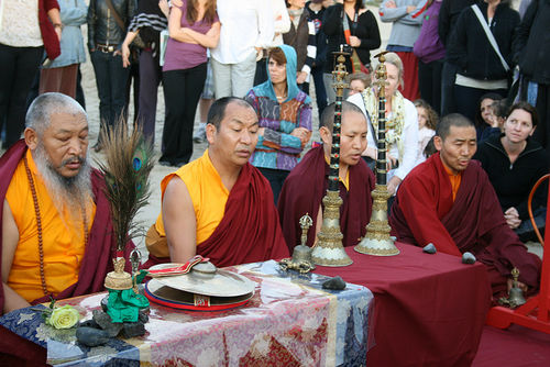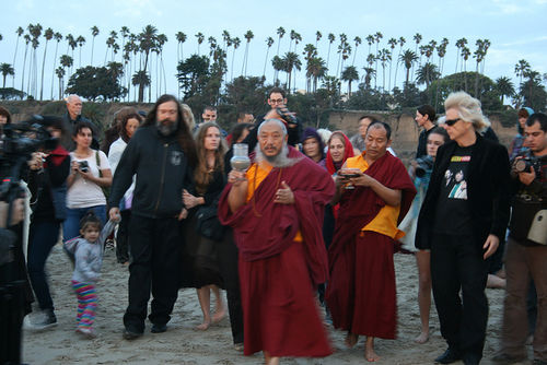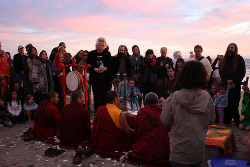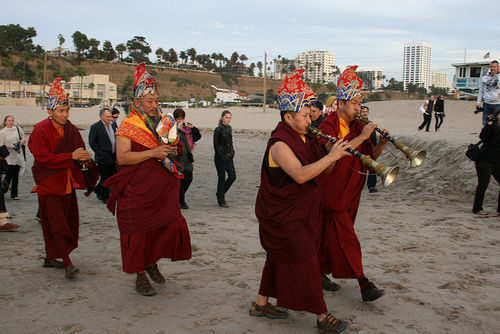 The mandala that the Lamas will make this fall represents Chenrezig, the embodiment of the compassion of all Buddhas combined. The creation of this mandala is intended to help the viewer generate boundless compassion for all beings. Visitors to the Hammer can watch the Lamas create the Mandala and are invited to join the Lamas in pujas at the beginning and end of each day. The pujas include prayer and meditation intended to help bring to mind the qualities of the Buddha of Compassion. After spending two weeks creating the mandala with intense concentration, the final grains of sand are placed and then the entire sand painting is swept up in a final display of impermanence. The Lamas and the visitors bring the collected sand to the ocean and offer it as a blessing as part of the dissolution ceremony.