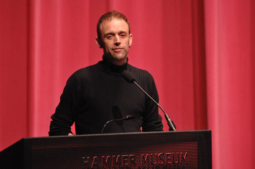 Belgian artist Johan Grimonprez was in residence at the Hammer from November 2007 to April 2008, and his residency complemented a long and continuing relationship with the museum and the university. This association began with his early film Dial H-I-S-T-O-R-Y (1997), which was first presented at the Hammer in Fair Use: Appropriation in Recent Film and Video, a 2005 exhibition organized by UCLA critical and curatorial studies graduate student and Hammer intern Matthew Thompson. Since then Grimonprez has given a number of lectures at the museum, and Dial H-I-S-T-O-R-Y was shown in the video gallery during his residency. He was also a key member of the Hammer’s Artist Council, and his groundbreaking films continue to be discussed and shown in UCLA classrooms.