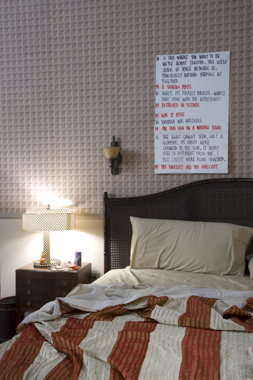 New York–based artist Aïda Ruilova conceived and produced her most ambitious work to date during her eleven-month Hammer residency, from August 2008 to June 2009. After multiple short trips to Los Angeles—during which she visited historic locations and architecturally significant buildings and met with actors and artists who appealed to her interests in noir and L.A. iconography—Ruilova shot Meet the Eye (2009), starring actor Karen Black and artist Raymond Pettibon, on a soundstage in Silver Lake.