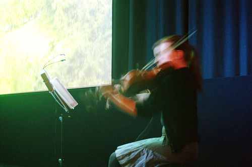 The larger work was built on similar processes, centered on two “field performances” by Guthrie and Streb. Both performed their respective instruments in their neighborhoods while Pisaro and Brookshire recorded the changes in sound and light from sunrise to sunset. Streb riffed improvisationally on her viola along with the sounds of Highland Park, while Guthrie played cello on a bluff overlooking the Santa Clarita Valley. These site-specific recordings were then remixed and replayed for the performance in the Wilder, with the two musicians performing live alongside. Madison’s real-time shots of Los Angeles provided a meditative complement to the layers of sound and music, with ghostly forms of cars and people inscribed on the immovable landscape like so many palimpsests.