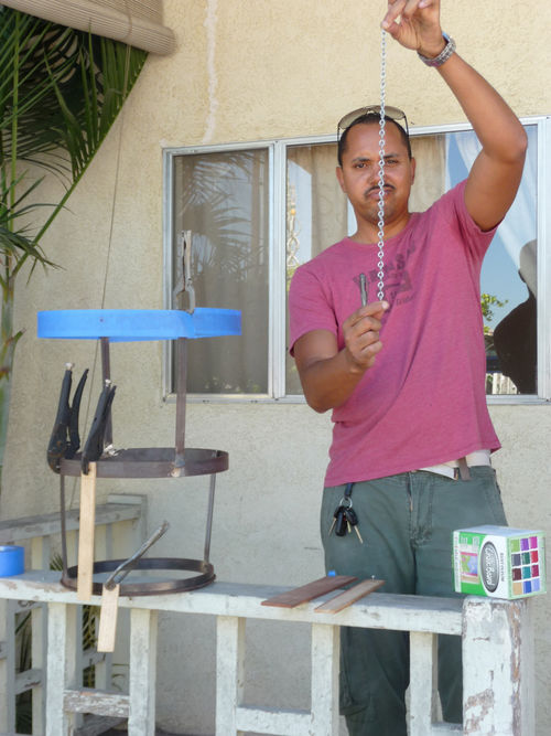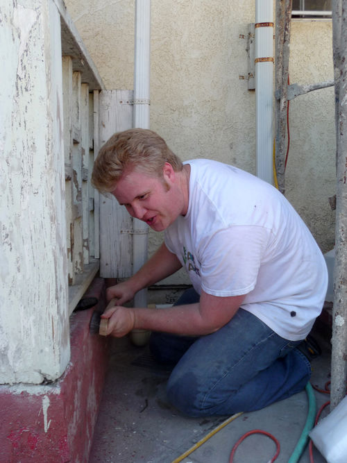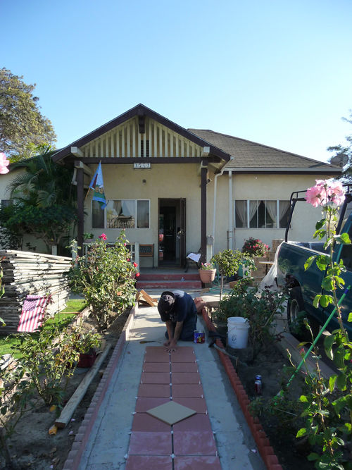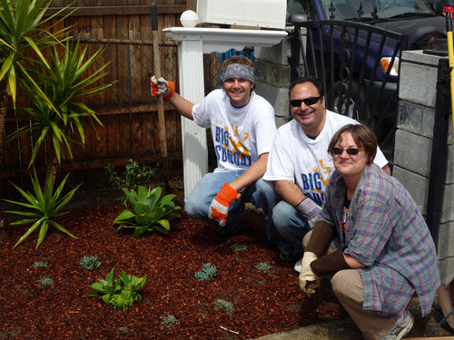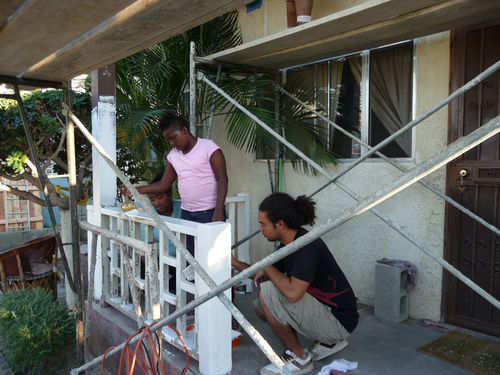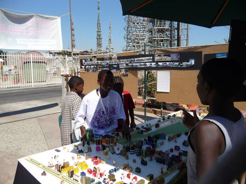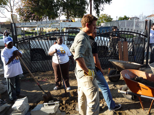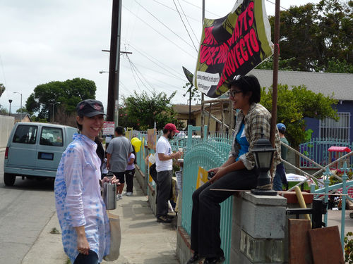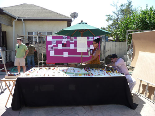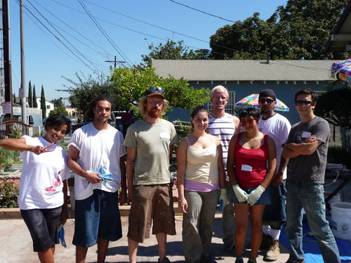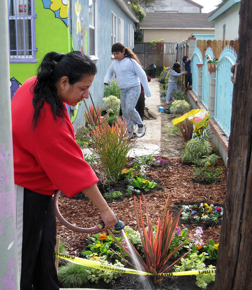 Arceneaux’s Hammer residency began with a Watts House Project launch event on September 27 and 28, 2008, which brought together supporters and community members from across Los Angeles. The center of activity was the Madrigal family home (1762 East 107 Street), with an outdoor exhibition, participatory planning workshop by James Rojas, and volunteer activities all occurring on the property. The outdoor exhibition, set up on the Madrigal driveway, featured photographs from the earliest Watts House Project initiatives in the mid-1990s, an historical timeline of Watts, and about 25 imaginative, playful proposals from Los Angeles–based artists as a part of the virtual redevelopment project. These proposals reimagined houses on the block, and several of them (including Castaño’s floral mural design and Grant’s “Love” sculpture) later served as points of departure for realized projects. The launch event coincided with the Watts Towers Jazz and Drum Festivals, and the festive weekend spun off eddies of continuing activity and engagement in the neighborhood.