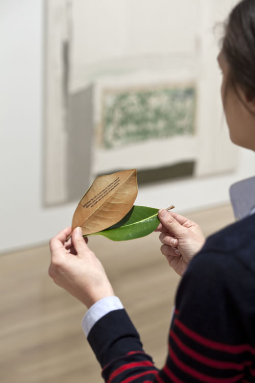 Charles Long inaugurated AIR 2011 with an interpretive piece for All of this and nothing, the Hammer Invitational, January 30 – April 24, 2011. Long encouraged visitors to consider the works in the exhibition in different ways with a series of prompts stamped upon leaves, which visitors may pick up at the exhibition entrance and refer to throughout the show.