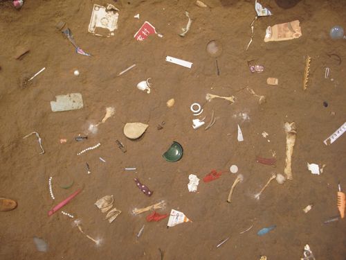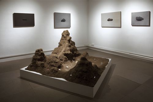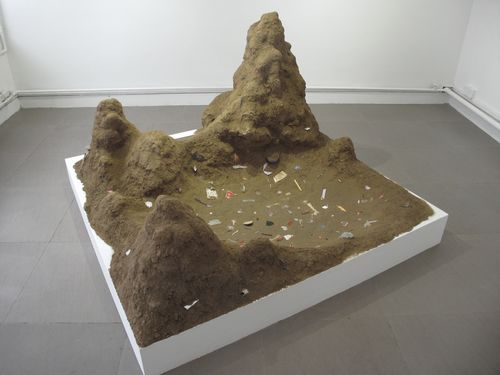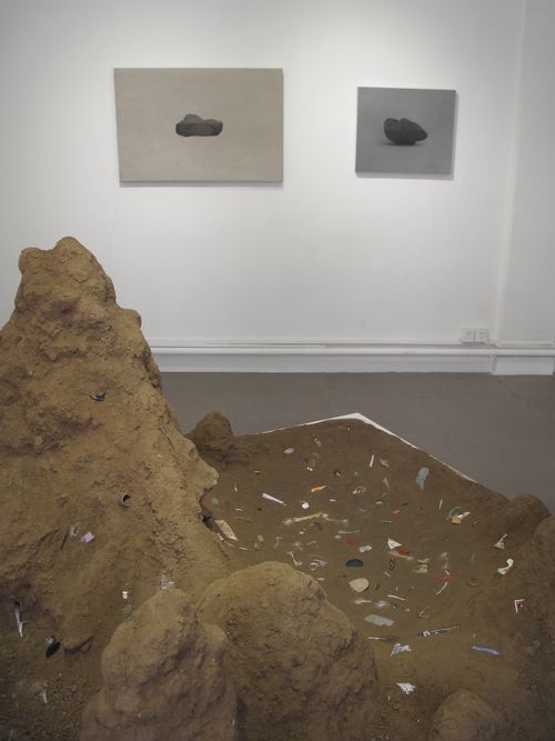 In the main gallery the dominant work is a large sculptural installation made of dirt and the detritus and refuse of the city. It resembles a model of the towering misty mountains of Guangxi found in traditional Chinese landscape painting, or even of Mars, or an alien world of the future that has imbedded in its landscape the fossilized garbage of a distant world’s extinct civilization. Wu has built mountains with urban 21st century soil that hold a reservoir of stories and lives seen only by what people have left behind.