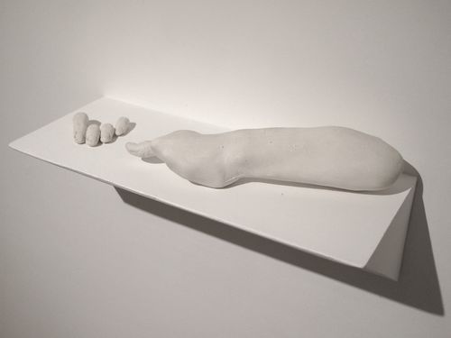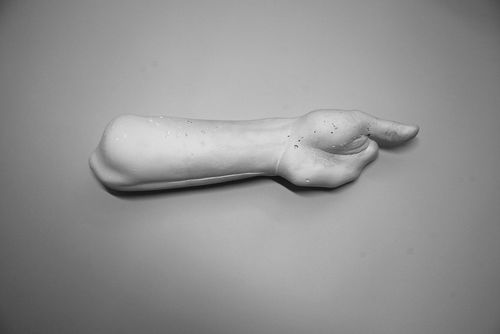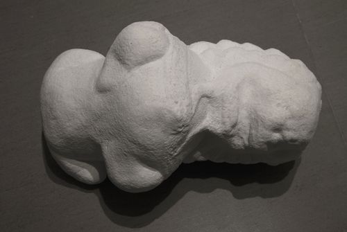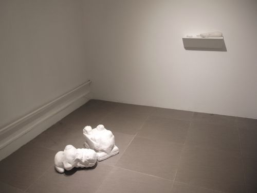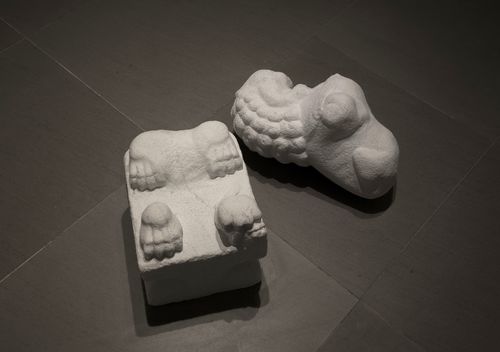 Also included in Wu’s exhibition are his plaster sculptures of arms, hands, and fingers separated from their bodies. Their surfaces are worn smooth, all remnants of turmoil from their dismemberment or pains of life have been removed and their identities washed away. They are like ancient alabaster bones that rest glowing white in a place far away from all pain and worry. A marble Chinese Foo Lion lies on the floor, the place where it traditionally stood proudly keeping guard over the house and its inhabitants. But now it lies broken and forgotten, its face worn away by the river of time. Its features barely revealed seem to be the ghost of a creature within pressing out against the soft stone for release. It is a haunting portrait of an anonymous personal and cultural identity.