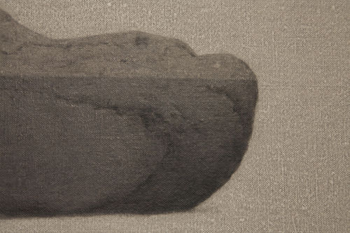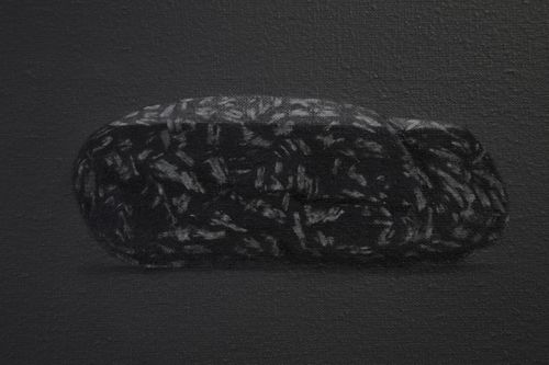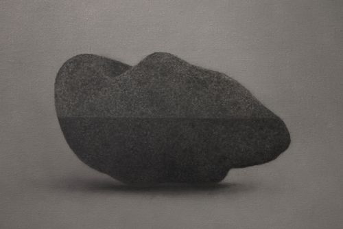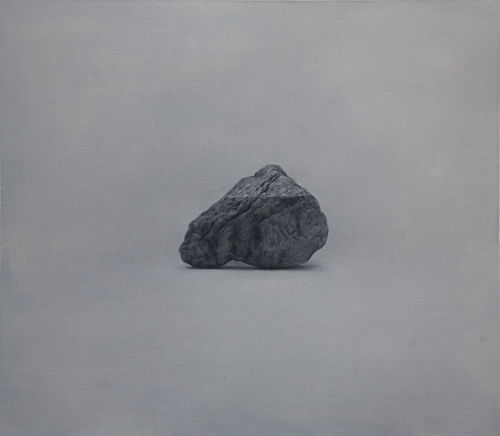 The paintings in his Telescope exhibition are the newest incarnation of his quiet investigation of water hiding in stone. Wu’s oil paintings are more closely aligned to ancient Chinese literati and atmospheric perspective paintings than they are to western painting, but they also are connected to the photograph, a western invention. Simplifying his subject and background in minimal hues of grey Wu paints detailed portraits of common stones he has gathered from the city’s roads and highways. These roads, for many people who have migrated to the large cities of China for work, have replaced the rivers of their childhood. These stones are of no importance, they seem to have lost their way as time has eroded their features and drained them of color.