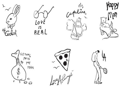 Produced by Ear-ink, the tattoos are sold as a set for $100 or individual sheet for $25: John Baldessari, Friedrich Kunath, Dave Muller, Laura Owens, and Raymond Pettibon.
