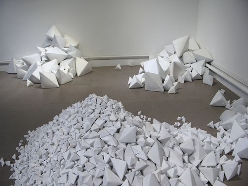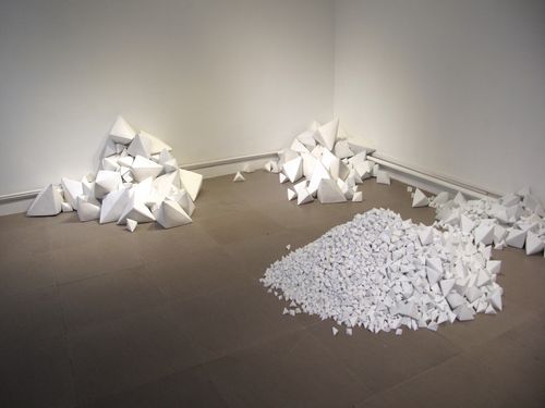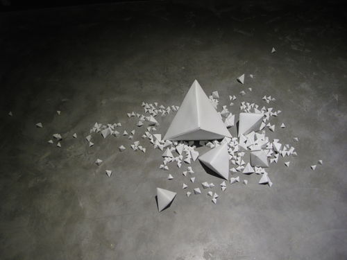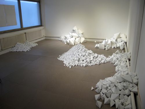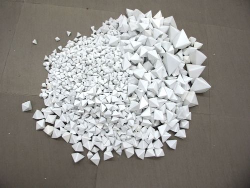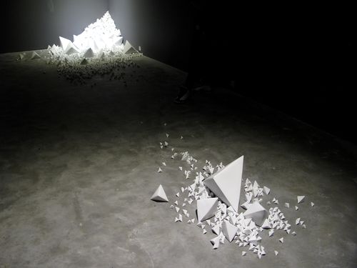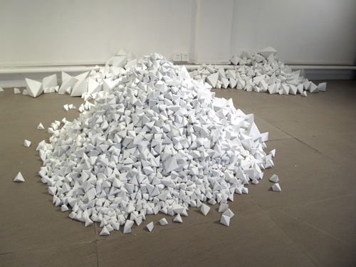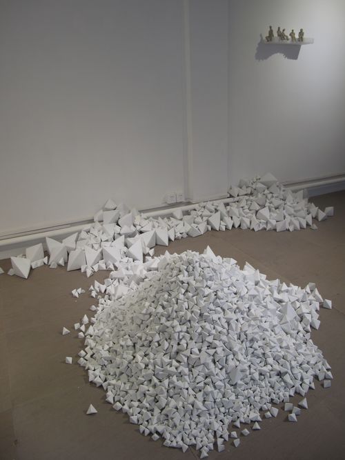 Past Hammer Projects artist Chen Qiulin’s installation at Telescope has continued to grow as more porcelain ‘zhezhi’ (folded paper objects) have arrived from the Jingdezhen porcelain factory in southern China. The title of the piece, 14,235, is also the number of individual pieces in the work of art. She has divided the work into two installations, one at Telescope in Beijing and the other at her solo exhibition at 1000 Plateaus Gallery in Chengdu, which also includes photos, sculptures, and the 7 channel video installation Empty City. The white wall installation photos are from Telescope and the dark wall installation photos are from 1000 Plateaus.