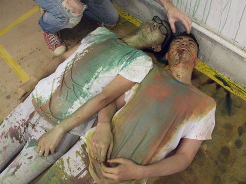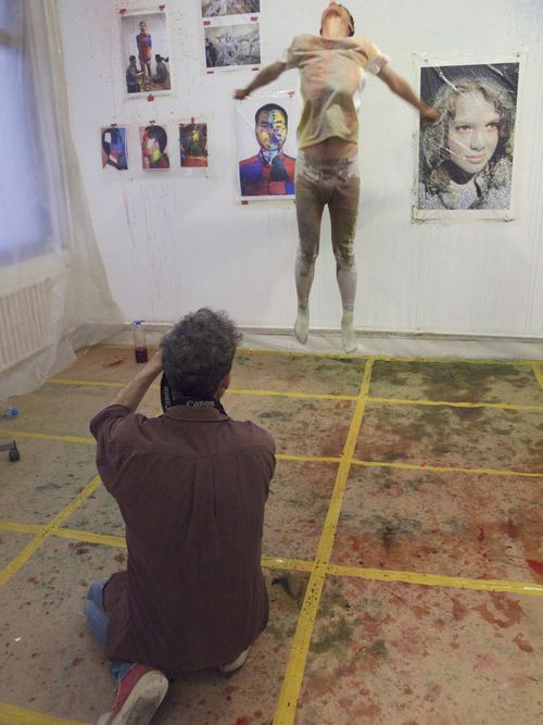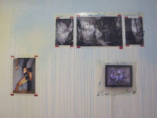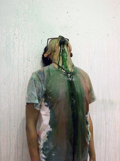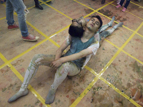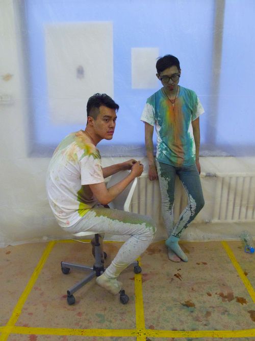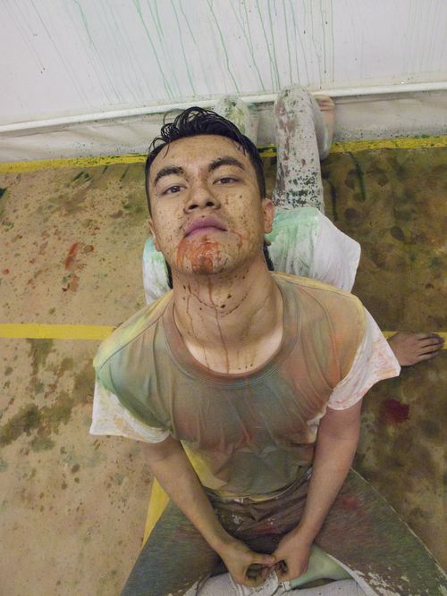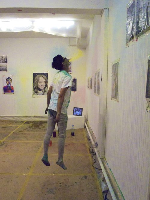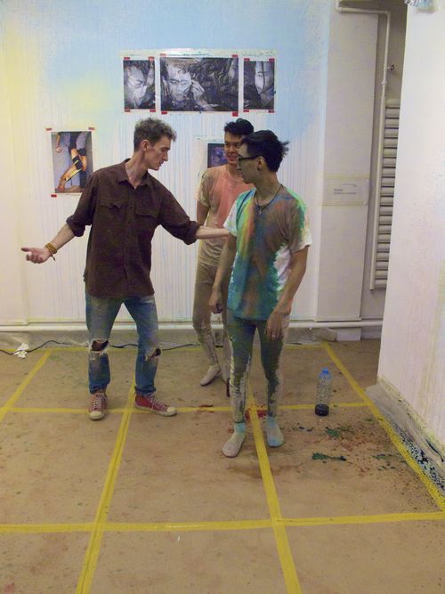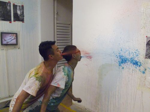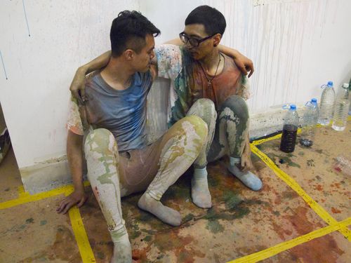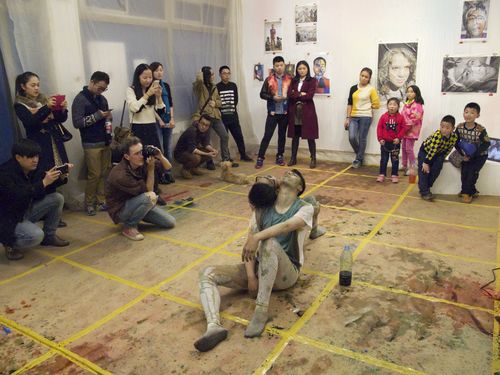 Oliver Herring’s 3rd major all day performance is one of his trademark works. In Beijing it was titled, Areas for Action, Beijing: Color Spit. For this performance Herring enlisted 2 participants who wore light gray thermal leggings, white socks, and white T-shirts. The gallery floor was covered in brown cardboard pieced together with yellow tape. Under the direction of Herring the 2 actors filled their mouths with food color tinted water from large water bottles and began to spit; at each other, into the air, onto the walls, ceiling, floor, and existing art works. Herring choreographed them into multiple positions and actions as they spit blue, green, yellow, and red colored water, Herring constantly photographing the process as he moved in and around their actions. By the end of the day the gallery, the models faces and clothes, and everything else were drenched in streams and splatters of rainbow colors. Again, the community turned out in large numbers to witness this exhilarating and strange interaction between an artist and his 2 partners. Towards the end of the day the public was invited to suggest poses and actions for them to follow.