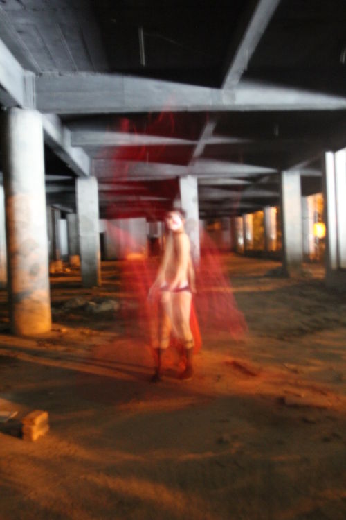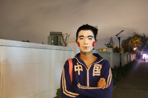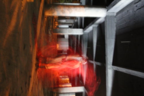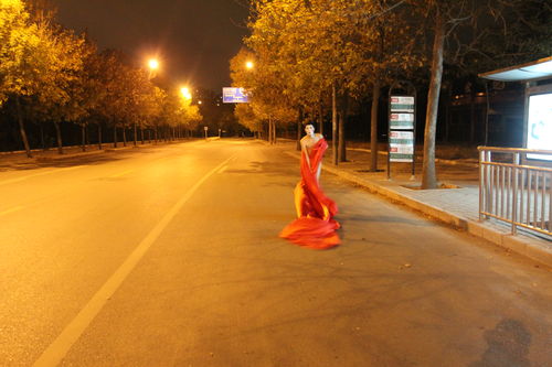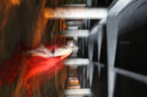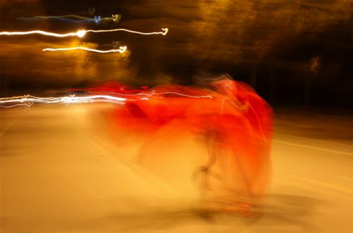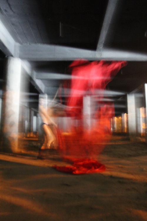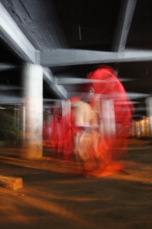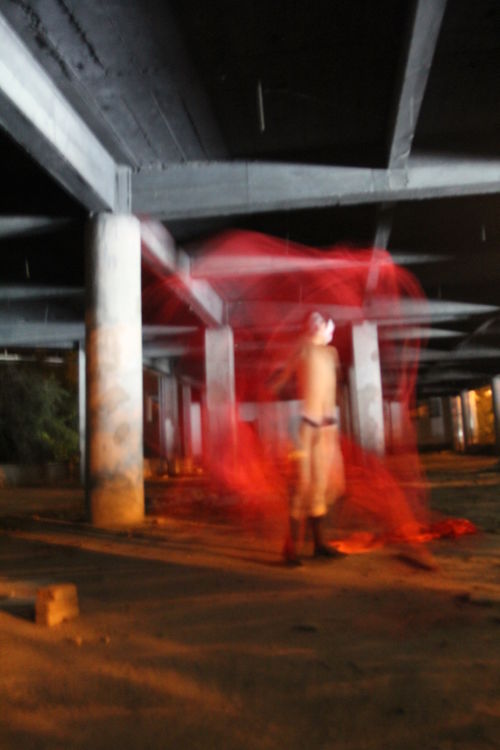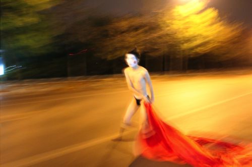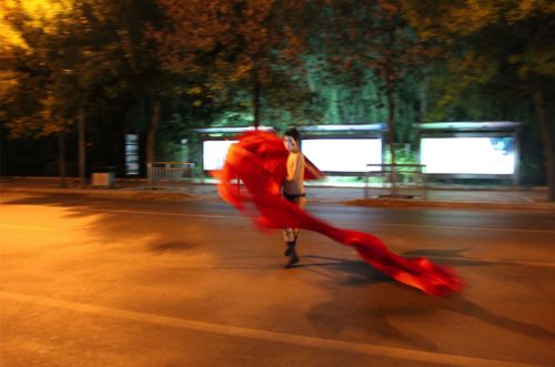 Much of Deng’s work seems to emphasize his outsiders role socially. He was a joyous, sensitive, and loving individual but felt alone in a world that could not see, hear, or accept him like he was or others like him. He felt he had no voice and little hope except on the stage that he built in his creative imagination where through his movements and personal iconography he could tell his story. There is a child’s simplicity and foolishness to his actions, but as children are, his aim is true and his voice is arrestingly honest and moving. In this performance Deng chose the cover of night in which to play. The night is a shroud that protects and hides and gives freedom of movement and expression, a world that is hazy and indistinct, but also provides contrast. Deng’s long red material suggests a river of blood flowing out into the world. He carries his vulnerable heart in his arms for all to see. Blood is the power of life within our bodies but, when poured out, it also has the power of sacrifice for others. This river flows in and around Deng, like a womb, and then is released into the air following him like a hero’s cape or the translucent wings of a bird in flight. His painted face, drawn from a memory of a cartoon character from his childhood, glows like a white lantern peering at us through our bedroom window. His gaze is silent but straightforward and with the innocence, love, and insight of a child he waits our response.