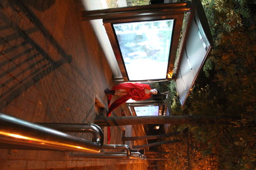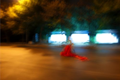 Shadow takes us on a dream like journey to vaguely familiar places in the city’s ever-present twilight. Out of focus images in hazy landscapes whirr by, occasionally resting long enough for us to make out a ghostly figure with a white pasted face draped in a flowing river of red satin. The figure is strangely familiar but alien and untouchable, like a shadow on a wall. Deng treats Beijing City like a stage for a new Chinese Opera, incorporating ancient tropes of costumes and make up but reducing them to their most simple and elemental forms; the long flowing “water” sleeves of the elaborate Peking Opera actors gowns, which are used to express emotions, have become Deng’s entire costume, the painted face that depicts the identity or emotions of a character is now just a mute yet haunting pancake white mask with thick black eyebrows and red circles for cheeks and lips.
