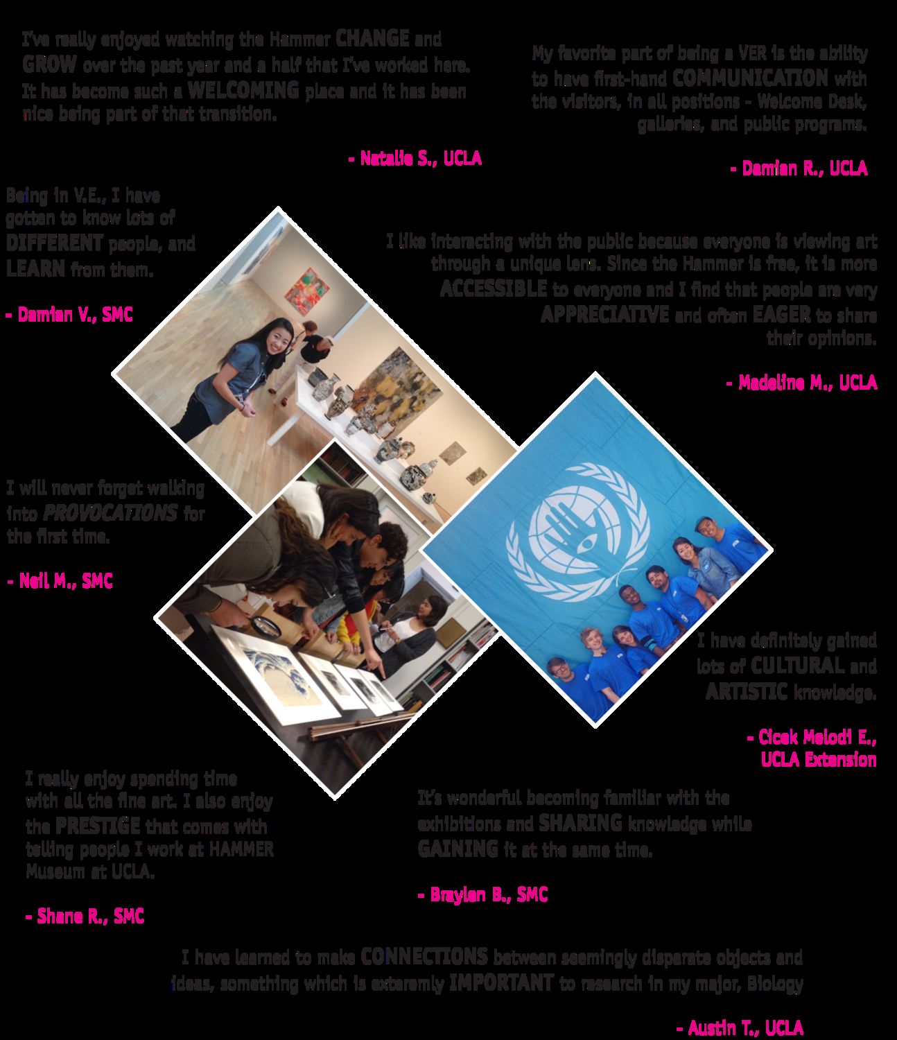 This cohesive student workforce has had a transformative effect on the Hammer. VERs ensure visitors a more seamless visit; their energy and optimism promote a dynamic and open environment unlike any other museum in Los Angeles. To commemorate VE’s one-year anniversary this June, we have pulled together some figures on what the department does collectively and the individual voices that make it possible.