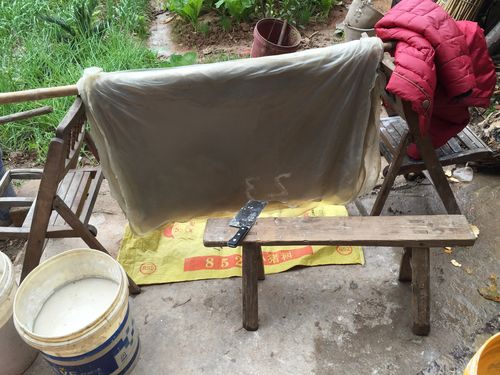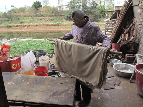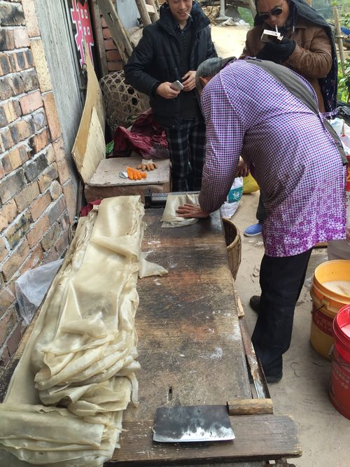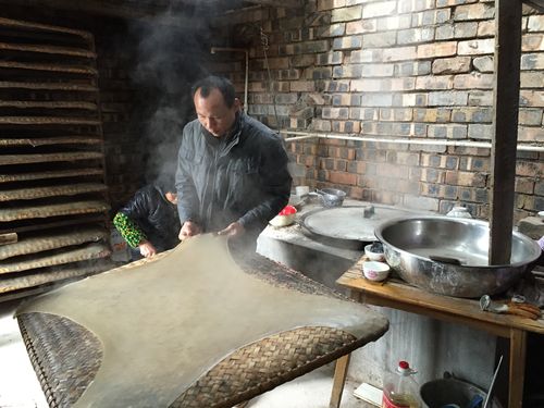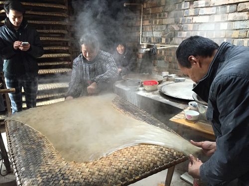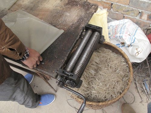 Almost every day we took a walk into the mountains, or motorcycle rides to other parts of the area to meet other family members and see what they did from day to day. One morning we went in to the town of Cha Ling to visit an old house where his grandfather helped make fresh hand made sweet potato noodles the same way they have been made for maybe centuries. This only happens once during the year for 20 to 30 days. They make about 25 kg of noodles—which sells for about $4 per kg—starting with the sweet potato flour, mixing it into batter, pouring it into huge pans, and covering them over a wood burning fire and water to be steamed into a clear gelatinous skin. These elastic skins are removed from the steam and stretched over large square wicker forms and then put onto racks to cool and dry. The sweet potato skin is removed then stacked like laundry and hung outside to wait its turn to be cut and shredded into noodles by a hand-cranked shredder. Fascinating and delicious!