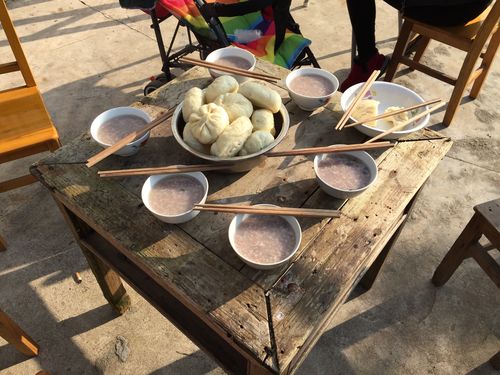 Every morning we woke up to fresh baozis (steamed buns with pork and vegetable or a sweet brown sugar syrup inside), and either bowls of rice porridge or a fermented sweet rice soup his grandfather makes. One bowl of that breakfast wine was never enough…!