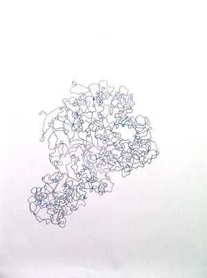 Microcosmic Selflok also serves as a fantastic, explicatory enlargement of dimensions mysteriously secluded within those “flat” material supports with which artists must interact whenever they draw, paint, or print images. This aspect of the present work is more easily accessible via description of another series of works that Armanious has produced in recent years. In 1998, during a twelve-month residency in France, he returned to figurative drawing and painting after some years of working in a more definitely sculptural mode. This return was prompted by an external circumstance somewhat beyond the artist’s control: the bedroom walls of his temporary accommodation in Hautvillers were covered with wallpaper embossed in imitation of crude plasterwork, and in his everyday encounters with this decorative surface Armanious began to “see” curious figures emerging from its amorphous low-relief pattern. Purchasing a roll of the same wallpaper, he drew on it with a pen, tracing the strange profiles articulated within or by the crevices and cavities of the textured surface. Strangely, what emerged were humanesque forms: squat, brutish hybrids and Bruegelian rustics belonging to some indeterminate, bucolic past, together with the elfin inhabitants of some imaginary “middle earth.” Apparently the encrypted materiality of the supporting surface had itself generated the artist’s will to draw and had itself produced these particular images of strange, enchanted beings. It seemed that the drawings were driven by something within a normally concealed dimension of the surface itself—that the surface possessed its own willful imagination independently of the artist but to which he had privileged access and could respond.