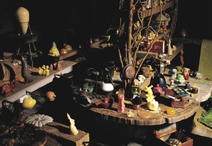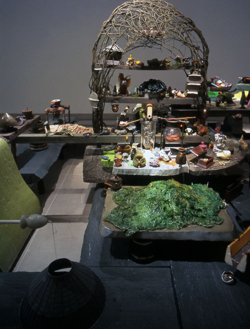 Hany Armanious’s Selflok, 1994-2001 exists somewhere between Middle Earth and the interior design of a cheap hotel. Seeing dwarves and elves in sketches he produced by stenciling the convexes and concavities of cheap wallpaper inspired Armanious to create Selflok, the ancient-mythical-modern elvish homescape depicted in his Hammer installation. An amalgam of hotmelt (an easily melted and shaped commercially produced syntetic latex), polystyrene, found objects, and other mixed media, the otherworldly Selflok, 1994-2001 bends time, space, and matter.