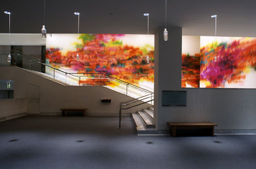 The work of Düsseldorf-based artist Katharina Grosse presses against the confines of the painterly tradition. Engaging a range of surfaces, including aluminum, canvas, paper, and existing architectural elements, Grosse's site-specific abstract paintings are executed in a manner that emphasizes color over brushwork, movement over stasis, and impermanence over permanence.