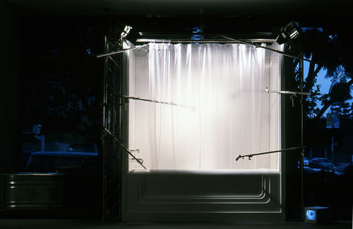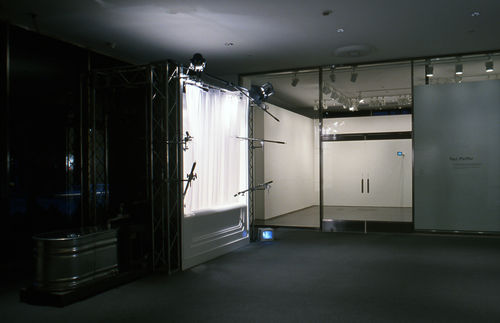 Janet Leigh in Psycho. She too is a memory in Self-Portrait as a Fountain (2000). Taking the famous shower scene as its central metaphor, the piece has tiled walls, a plastic curtain, a running shower, and rods indicating the angles made famous by the piece’s original creator: Alfred Hitchcock? Or Janet Leigh? Or Anthony Perkins in drag? Each contributed to the fame of the metaphor Pfeiffer has chosen, and yet one could never say who the author of this moment is. We remember the shower scene for a number of reasons: Janet Leigh’s tawdriness, Anthony Perkins’s wig, Hitchcock’s "eye." Each of them together or separately "slays" the audience. Pfeiffer underlines the issue of authorship in the piece’s title. If this is a self-portrait, where is the artist? In the water? The tiles? The curtain? Is he in love with a gay artifact, and if so, which one? Anthony Perkins in his wig or Janet Leigh in her bra or that daddy of the cinema, Alfred Hitchcock, who put himself in every film he created? Pfeiffer erases Hitchcock’s penchant for cameos by turning to a Duchampian model here: the artist is everywhere and nowhere in this self-portrait, which resembles love: distant and ever-shifting and having very little to do with the beloved.