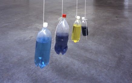 Feher's art draws upon the common language of disposable goods: plastic and glass soda bottles (labels removed), coffee jars and twist-off lids, metal cans, brightly colored marbles, bar straws, delivery flats, bottle caps, wooden fruit crates and plastic soda cases, pushpins, polystyrene bricks and translucent plastic grocery bags, old carpet squares and cheap plastic flowers. Suspended from the ceiling in clusters and bunches or arranged on the floor in stacks, lines, concentric circles, pyramids, columns, and other geometric configurations, the plainspoken objects in Feher's installations are quietly alluring. It can sometimes be hard to put one's finger on exactly what the difference is between the things he comes across and the work he makes as a result, and yet it is that barely discernible difference that is at the core of his art.