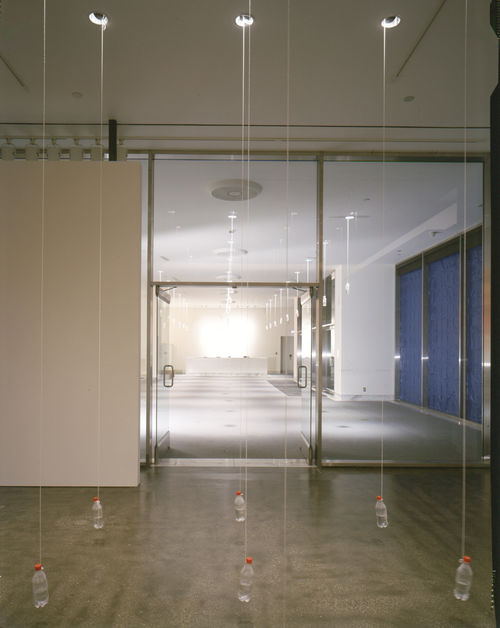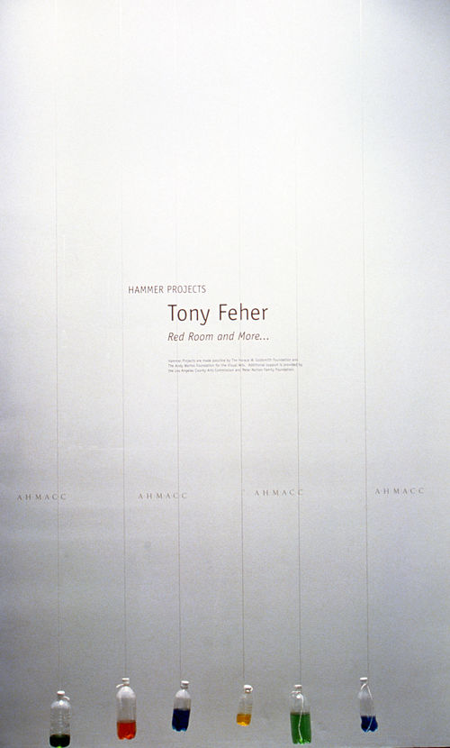 Composed of three separate environments, Feher's reconfigured installation Red Room and More (2001) comes to the Hammer Museum after premiering at the Center for Curatorial Studies Museum at Bard College. For a piece titled Adam's Light (1999-2001), Feher lined a section of the lobby window overlooking Wilshire Boulevard with blue plastic bags. Sunlight streaming through this translucent membrane suffuses the lobby's interior with ambient blue light. Inside the lobby, seven rows of white-capped plastic bottles, each partially filled with water, are hung from the preexisting ceiling light grid. Hovering at ankle height inside the lobby gallery are approximately twenty-five partially filled red-capped plastic bottles, also hung from ceiling lights that appear in a slightly tighter grid formation.