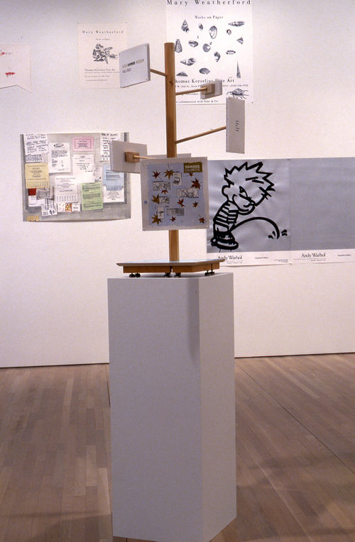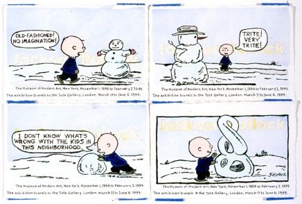 Dave Muller: Connections, features the artist's ongoing series of drawings and watercolors that are his personal interpretations of art exhibition announcements and invitations by various museums and galleries. Inspired in part by amateur flyers created by fans of indie-rock bands, Dave Muller began producing watercolors based on exhibition announcements of artists he admired. These acts of homage are not copies, however, as Muller transforms and personalizes them, often with a wry sense of humor. For example, in a 1999 series of four watercolors announcing the Jackson Pollock retrospective exhibition at The Museum of Modern Art, Muller drew scenes of Charlie Brown walking through a snowy landscape while commenting upon the artistic merits of different snowmen: "Trite! Very Trite!" and "Unimaginative." Muller also appropriates the work of other artists, only to transform it into something new. Muller clearly acknowledges the historical precedents to his artistic practice, yet in its anti-monumental stance and idiosyncratic character, his work is very much his own.