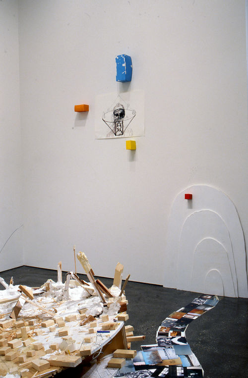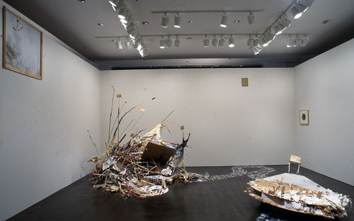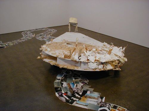 In Schnell's installations the central object and its surrounding and ensuing materials, like a nervous system carefully removed and laid out for observation, act in concert, a portrait of a psychological event, where one can observe a visual conversation between interior selves. The purpose of this dialogue is the hope for transformation through understanding, hope born out of a deep longing for sanity, peace, and happiness. The boat is a portrait of one thing that wants to be something else but doesn't know how to get there or even what it is that it wants to be. This is a human portrait: the dissatisfaction of knowing that there is more, and life's search to find it. We all experience this Möbius strip of idealism and failure and the heartache of its repetition, but we continue on. The failure of idealism (or the idealism of failure) is the most energizing component of Schnell's work; it is the open door to the continuation of the journey. It doesn't matter how weak or how frail we are; as long as the book does not close, we may still reach our destination.