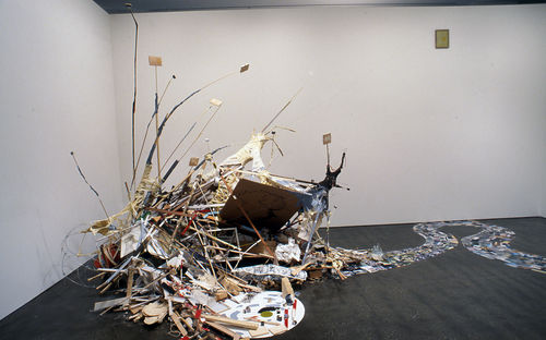 Using personal material such as snapshots, drawings, broken bits of wood, ash trays, string, paper, and shoes accumulated from his own life, Eric Schnell has built a sculpture in the form of a boat whose cargo is his own fears, yearnings, internal conflicts, and desires. Schnell's poetic juxtapositions of form and formlessness, the pragmatic and the useless, provide visual metaphors for the evolution of the self as a fractured entity struggling for wholeness. Says exhibition curator James Elaine, "In Schnell's sculpture we see the central object and its surrounding materials...like a nervous system carefully removed and laid out for observation, acting in concert as one."