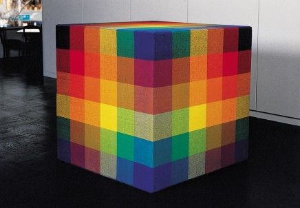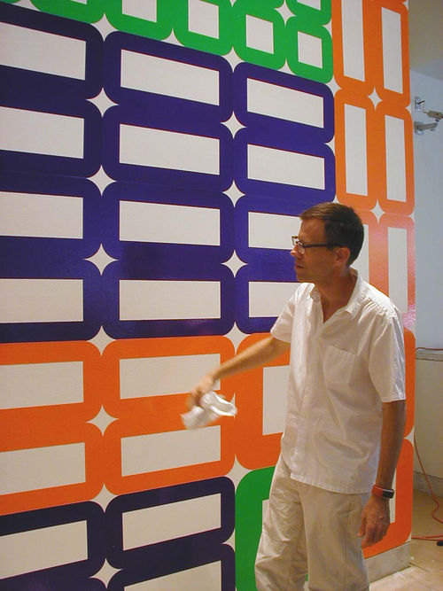Artists, of course, have been saying this for centuries-that they know better and can do better-that they can make a better painting or a better sculpture. Jim Isermann, however, is an artist/designer in the tradition of Giulio Romano and Andrea Palladio. He thinks he can make everything better-that he can make the world better by improving the quality of its objects and surfaces and make the world even better than that by improving it more succinctly, efficiently, and economically than anyone else. These are the disciplines Isermann accepts in lieu of a boss: simplicity, elegance, industry, and economy. Adhering to these principles, he begins most of his projects straightforwardly: with a primary modular unit derived from the vast repertoire of modern design and with a minimal palette of industrial color. For walls and floors, he elaborates these elements through a set of simple algorithmic permutations to generate a pattern of maximum interest and complexity. He applies this pattern to the walls or the floors as they exist using the most economical and efficient means available. In situations where a more ornate surface is required, labor-intensive craft is applied instead of costly materials.