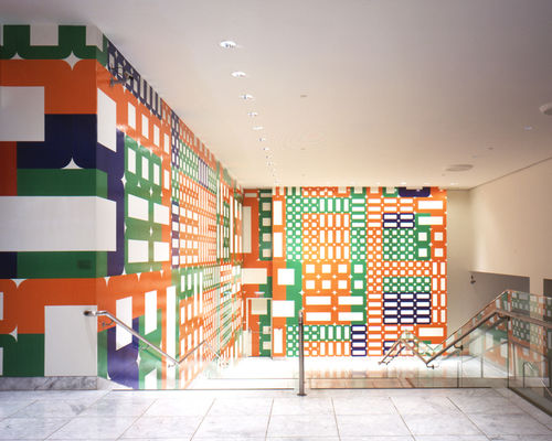 Critic Dave Hickey describes artist Jim Isermann as "a California artist with Bauhaus tendencies, Minimalist agendas, and formalist precedents in the Abstract Classicism of John McLaughlin and Frederick Hammersley." Using a multicolored assortment of vinyl decals in complex geometric patters, Isermann has created a mural along the Hammer Museum's lobby staircase. Isermann's vibrant, algorithmic arrangement of adhesive tiles marries the populist reach of handcrafted kitsch with the dramatic architectural impact of large-scale public murals.