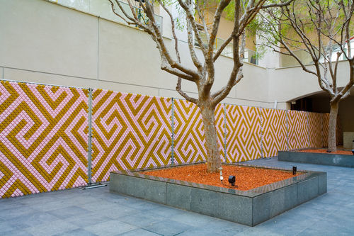 Jim Isermann has designed a temporary fence surrounding the Museum's Billy Wilder Theater construction site. The design, which uses 40,000 Put-in-Cups, is based on the traditional Greek key pattern and resonates with the formal geometry of the Hammer Museum architecture employed by Edward Larrabee Barnes. Put-In-Cups are diamond shaped plastic cups designed to lock into chain link fence.