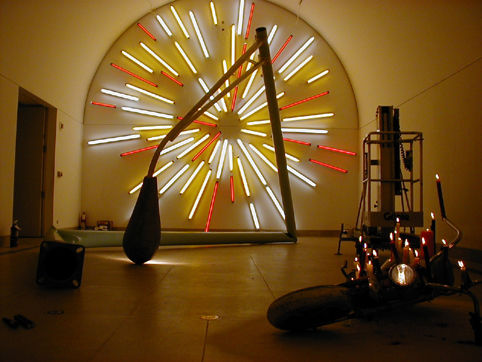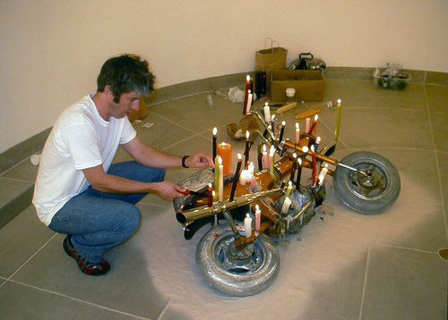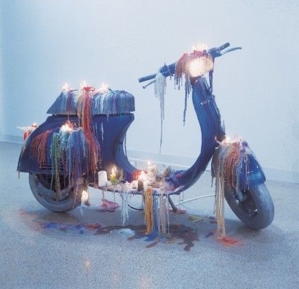For the exhibition at the UCLA Hammer Museum, Handforth has selected an installation that is tailored to the site's history as the former home of Leonardo's Codex Leicester. Taking advantage of the gallery's chapel-like vaulted ceiling, he has lined the walls with rows of fluorescent lighting; on one end of the space, he used such lights to create a large mandala-like burst. Again he is playing with the work of a modern artist, Dan Flavin, using his signature medium to representational ends. (In the past, in fact, Handforth has used such lights to represent the Union Jack on gallery walls.) At the same time he admits that he likes the medium not for its neat minimalism, but because the lights are "as cheap as a ball-point pen," even while providing a mood-setting, beautiful contemporary light. And, putting aside his beloved Vespa, Handforth selected a Honda motorcycle that's more in tune with the Los Angeles environs-but that is no less romantic, since the vehicle drips with candle wax. Set amid another of his twisting lamppost sculptures, the piece becomes a relic for a uniquely American church.