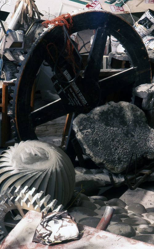 Takahashi found the Hammer’s auditorium to be in a provocative state of physical and symbolic flux. A nonoperational movie theater that for now is being used as a catchall storage area, the auditorium isn’t functioning in the manner it is meant to, yet architecturally it exhibits many of the basic structures required for its intended purpose. Keeping this in mind, Takahashi decided to transform it into a kind of dysfunctional set for an unfilmed movie about Los Angeles and its environs, with herself as set designer and art director. Armed with a truck and two knowledgeable assistants, she filled the space of what would eventually become Auditorium Piece (2002) with refuse collected from the streets of L.A. as well as from movie studio prop houses, warehouses, and back lots. Significantly, she thinks of all of the materials she collects as “props,” whether they are acquired from a prop house or picked up off the street. A coffee maker is a “domestic prop,” for example, as is a piano or a mattress. By likening her objects to props, Takahashi foregrounds the fact that their symbolic value depends upon the particular context in which we find them. Once discarded, an object is dislodged from its everyday, time-bound functions and is free to assume new ones in the same manner as a prop, which takes on different symbolic meanings depending upon its function and placement within a scene.