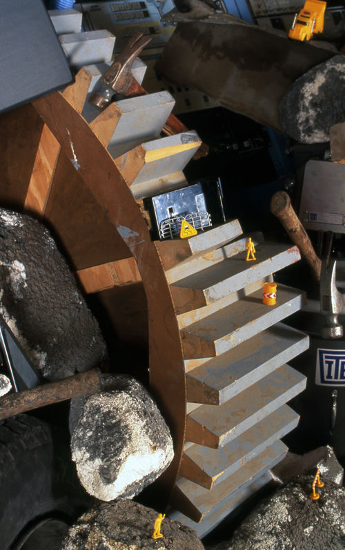 Takahashi's installation occupies the unfinished concrete shell of the Hammer Museum theater. Incorporating materials scavenged from the streets of Los Angeles, electronics junkyards, studio prop houses, and other sources of industrial refuse, Takahashi has created a highly idiosyncratic "map" of our city as seen through her eyes. Hammer assistant curator Claudine Isé says, "Tomoko Takahashi's installations pose a challenge to her audience. One of the clichés often used to describe modern and contemporary art is that it 'looks like a pile of junk.' Rauschenberg's early combines, for example, were often dismissed on those terms. Tomoko's works certainly can feel overwhelming in their sheer, sprawling mass. But look closer and you see that she has an incredibly intimate relationship to her surroundings. Her installations also invite certain questions, such as why we give such tremendous value to certain kinds of objects while discarding others without a second thought, how we make distinctions between what is useful and what isn't, and what the consequences of those decisions are."