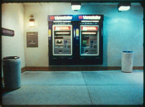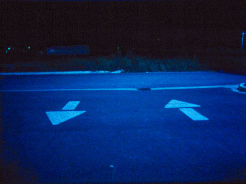 Deborah Stratman describes her work as “an uncompromising look at the ways privacy, safety, convenience, and surveillance determine our environment." In Order Not To Be Here, 2002, is also a lyrical meditation on the suburban American landscape. Shot completely at night, it unfolds in a series of grainy shots of empty parking lots, unattended ATMs, brightly lit subdivision nameplates, and nighttime freeway traffic. These relatively quiet images are bracketed by infrared footage of what appear to be an arrest and an escape. Interspersed throughout are snippets of police radio conversations, TV newscasts, sirens, and car alarms.