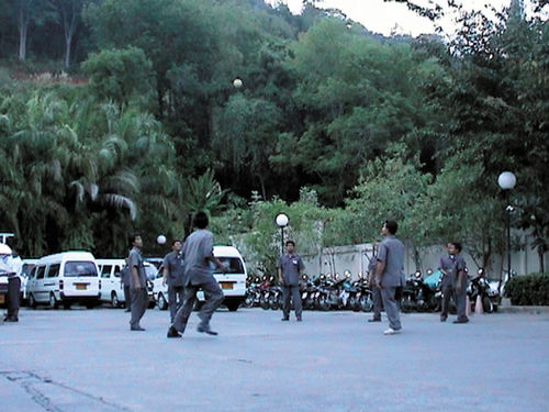 The Romanian artist Mircea Cantor lives a life of voluntary and perpetual displacement. Born in 1977, Cantor left home soon after the Romanian borders opened in the early 1990s and began hitchhiking across Europe in order to see and understand how other people live. Yet he is acutely aware that the touristic gaze can be deceiving: prone to cultural bias, misinterpretation, and misread signals. Several of his recent works examine the luxury hotel industry, which touts the beauty and distinction of native regions yet steers travelers toward resorts that all look reassuringly similar (at least to Western eyes). Cantor’s video Dead Time (2003) takes place in a parking lot adjacent to one such resort. Seen in slow motion, a group of uniformed men are trying to keep a soccer ball up in the air for as long as they can. We cannot tell if the men are workers or prisoners, nor can we identify where exactly the game is taking place. The sound track—consisting of a slow, rhythmic series of gonglike tones—heightens the sense of entrapment. The men are in fact taxi drivers who work for a hotel in Thailand, playing soccer during the “dead time” between fares. The taxi driver’s job is to ferry tourists from one part of town to the other. Yet the drivers are themselves condemned to a kind of endless displacement as they drive from place to place without a final resting point. Their attempts to keep the ball in play mirror their ceaseless travel in support of the global tourist industry, of which they themselves can rarely, if ever, partake.