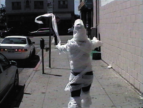 Terri Phillips’s videotaped performance Mummy (2003) draws our attention to the absurdities of trying to replay childhood experience as an adult. When Phillips was young, she and her brother would wrap white toilet paper around their bodies and pretend that they were mummies. But when Phillips reenacts the game alone, as an adult artist, in full public view, the experience could not be more different. The video shows Phillips covered in toilet tissue, winding her way through an institutional-like series of hallways and stairwells and out onto a busy avenue, her arms stretched forward like the mummies in old Boris Karloff films or Scooby-Doo cartoons. As she wanders down the street, she is virtually ignored by passers-by, who look the other way as she staggers past. Phillips’s make-believe alter ego appears increasingly pathetic as the tissue begins to unravel and trail between her legs like ragged clothing. Viewers may feel uneasy, not knowing whether to laugh at or feel sorry for this “undead” oddball, who brings to mind not only the displaced condition of homeless street-dwellers but also a number of tragically misunderstood literary “monsters,” such as Frankenstein’s creature, Quasimodo, and Boo Radley. By displacing a memory from the past onto the actions of the present, Phillips foregrounds the extreme difficulty, if not impossibility, of retaining the purity of childhood fantasy. In exchange Phillips provides us with a distinctly adult take on what it means to live as an outcast, in a state of exile from oneself, from one’s memories, and from the compassion of others.