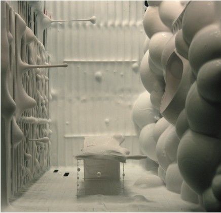 The tale recounted in Saskia Olde Wolbers’s Placebo (2002) also exhibits similarities to domestic melodrama, particularly soap operas. Inspired by stories the artist learns about from tabloid newspapers and television (in this case, that of Jean-Claude Romand, a compulsive liar who for eighteen years pretended to be a doctor for the World Health Organization), Olde Wolbers’s films often revolve around characters who exist somewhere between dreams and reality. The images in her films conjure womblike landscapes that remind us of the primary role that language plays in the construction of subjectivity. Her use of off-camera narration coupled with abstract, biomorphic imagery creates a decentering experience for viewers. As the piece opens, we hear an off-screen female voice: “Here I am . . . lying next to my lover, Jean, in intensive care.” The unnamed woman reveals that she and her paramour were both left paralyzed after their car crashed head-on into a tree. They were rushed to the same hospital where he worked as a surgeon and she as a nurse. As the woman tells her story, the screen oozes with an amorphous white fluid dripping horizontally across the screen (actually, paint made to flow through small wire constructions), an evocation of the woman’s mental state as she slips in and out of consciousness as well as of the “white shiny veins” of the hospital’s halls and corridors. The woman has gradually realized that her lover was not a doctor, nor was he married. He had invented an identity in order to hide the emptiness of his life. Just as a placebo (from the Latin for “I shall please”) stands in for an authentic remedy, Jean’s fantasies took the place of authentic lived experience, much to the dismay of the woman who finds herself unwittingly entangled in them.