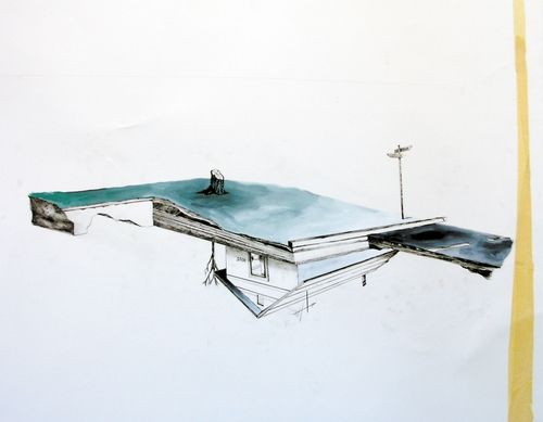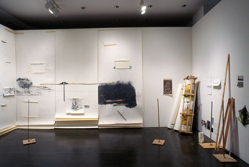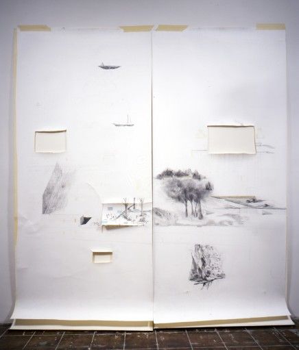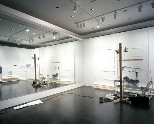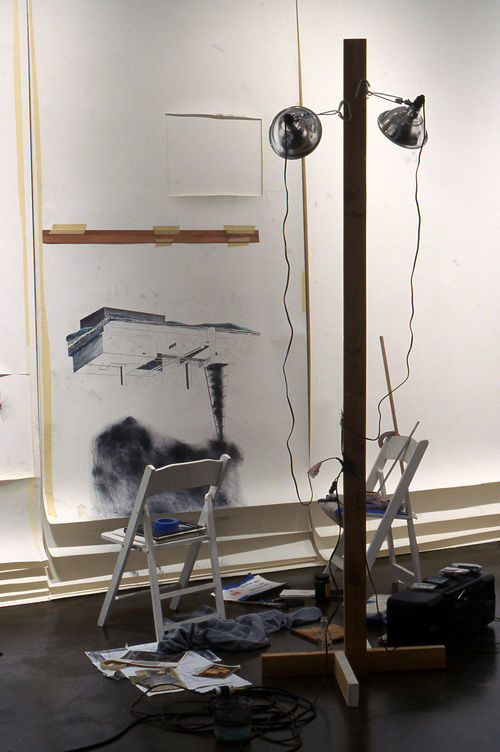 The work, like memory, is cumulative. Begun in 1999, Drawings of Removal has no foreseeable end. Also like memory, the work is bounded by space rather than by time. It contains all aspects of its own being and is created only within the makeshift studio that is a part of it. The tube in which the drawings are shipped from location to location stands in a corner, its mailing labels recording the work’s itinerary. The tools—pencils, pens, rulers—that create the work are scattered about. Joining them are snapshots, exhibition announcements, books, and clipped articles. The artist appears from time to time, changing elements, adding, subtracting. Gallery becomes studio becomes installation—the work is not so much something to see as somewhere to be. Like memory, it is a creative space separate from the place remembered.