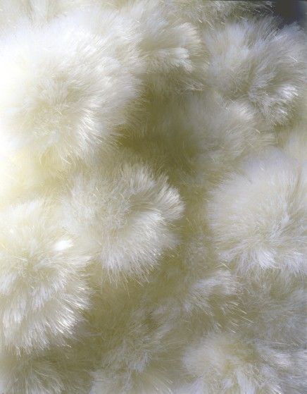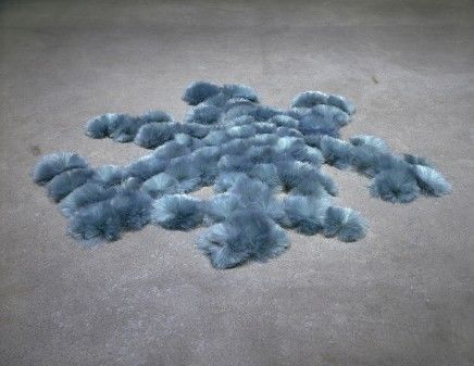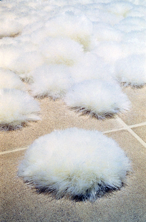 Lure (2004), Donovan’s contribution to the Hammer Projects series, ambiguously situates itself somewhere in the living realm between earth and sky. Segments of monofilament (more commonly known as fishing line), cut to approximately an inch and a half each and numbering in the millions, are divided into neat vertical bundles. When released on the floor, the segments splay concentrically outward, forming spiny interlocking globules when nestled together, which multiply into a sprawling hoard in accordance with Donovan’s repetitive placements. Heaping creates delicate crests that ooze into puddles, suggesting that a viscous liquid infused with preternatural spores dripped from the ceiling and sprouted in the favorable conditions of the gallery. The monofilament’s fiber-optic capabilities allow it to absorb an ephemeral spectrum of pastels gleaned from shifts in light density. As in Donovan’s other works, this evanescent effect entreats an otherworldly association that coalesces with Lure’s hyperfragility to suggest an organism transplanted from a liquid dimension. Its succulent seductions are of the tactile variety that beg for caresses, but it holds out the possibility of a stinging rebuke that enforces a respectful distance.