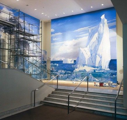 And what of us, gazing up at this monumental image? As we descend the staircase roughly paralleling the descent of the ice floe, we see before us an “Exit” sign and door interrupting the sweep of the mural’s image. Far from an unwelcome intrusion of reality, the door is actually a fundamental aspect of Glacier, reminding us that, after all, this is a museum in Los Angeles, not the end of the earth. We too belong to a process of nature; we too will someday step through a door marked “Exit” and embark on another journey. And on that passage we will take nothing with us, save perhaps a faith that the God immanent in the awesome power of nature is also present in the final melting of the heart and the subsequent flight of the soul.
