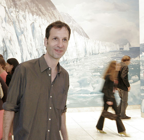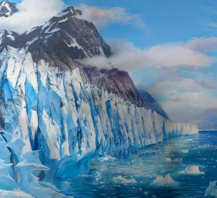 And so we might wonder about an eighty-by-twenty-foot depiction of an imaginary glacier, rendered in precise, scientifically accurate terms and mounted on a wall at the UCLA Hammer Museum. What more can a painting—even one of these dimensions—tell us about massive ice floes? A lot, it turns out, especially if the work is created by Adam Cvijanovic, a New York artist who specializes in room-size wall murals. With characteristic simplicity, subtlety, and a kind of aesthetic wisdom, Cvijanovic captures the majesty of glaciers while revealing in the hard, cold facts of their existence surprising layers of meaning and associations, ranging from ecology to physics to the destiny of human beings and the stars. On an even more profound level, the work suggests the artist’s own belief in an intimate universe where the laws of nature yield to a larger, more redemptive power of hope and renewal. A portrayal of one of the most inhospitable regions on earth, Glacier is far from inhospitable itself.