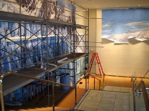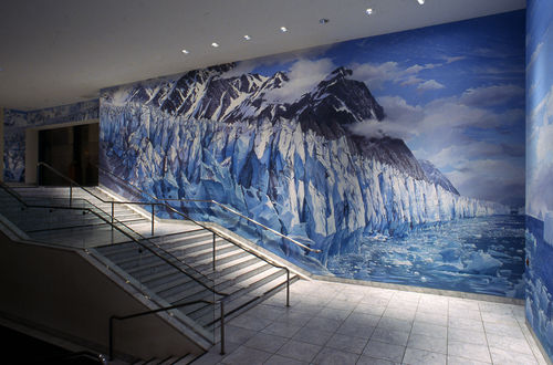 Cvijanovic’s mural is more than just a Nietzschean affirmation of life. The longer you gaze at the mural, the more it radiates a sense of joy—of love, even. Something ineffable and omnipotent seems present in Glacier: not an imperious superconsciousness that dominates the universe, but a more modest presence, intertwined in the process of nature, united with the molecules of ice, churned-up moraines, jagged calves, and tragic icebergs. Perhaps reflecting Cvijanovic’s own beliefs, the work has a hopefulness and quiet faith that gainsays the doom of entropy to affirm instead God’s promise in Ephesians: “World without end, forever and ever, amen.”