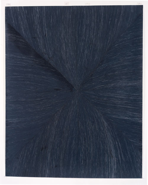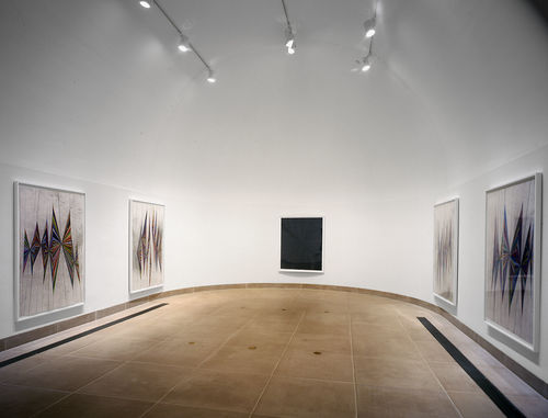 The drawings Black Flower and Black Water, which are the first of two new series, introduce an abstract motif that appears to be an organic variant of the perspectival motif. The compositions—consisting of densely filled segments radiating from multiple points in iterative, hand-drawn patterns—are divided roughly into halves or quadrants by thin, geometrical lines. These abstractions seem so familiar, and so profoundly part of American traditions, that it is difficult to accept that nothing quite like them has been seen before. Certainly Grotjahn's iteration, the density of the pencil marks in the segments, and the faintly gray division lines recall Stella's early Black Paintings, whose geometrical lines were rendered gray by the paint's bleed. (In fact, Grotjahn renders his lines with the same black pencil used to impasto the segments. The dissimilar appearance results from the lighter touch.) Precedents for dividing compositions into halves or quadrants, and for making hand-drawn patterns, could be easily listed, but the logic of Grotjahn's synthetic compositions remains elusive, suggesting that they are powered primarily by an internal motor.