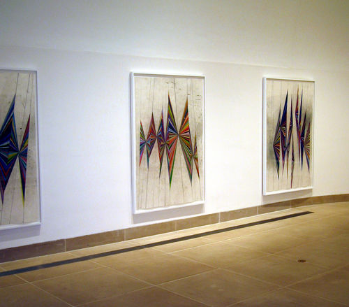 Los Angeles artist Mark Grotjahn uses varying schemes of one-point perspective to create his beautiful, hypnotic, multicolored as well as monochromatic Prismacolor drawings. The elegantly formal and perceptually perplexing aspects of his radiating or converging lines, which resemble sunbursts or endless highways, are subverted by random spills and marks made by overdrawing from other works.