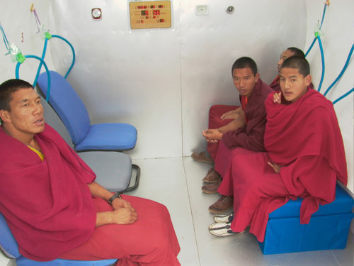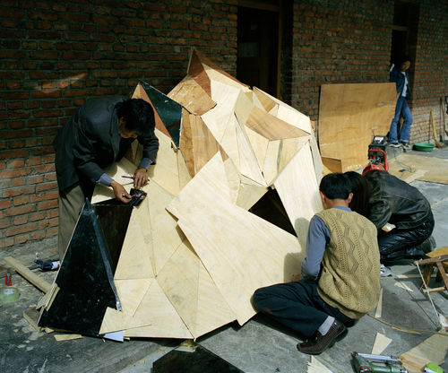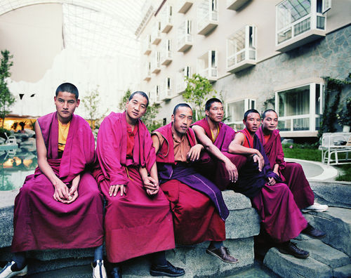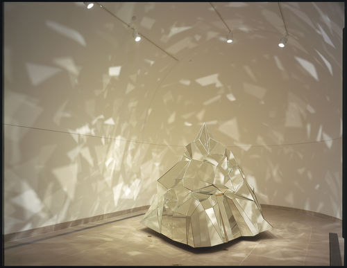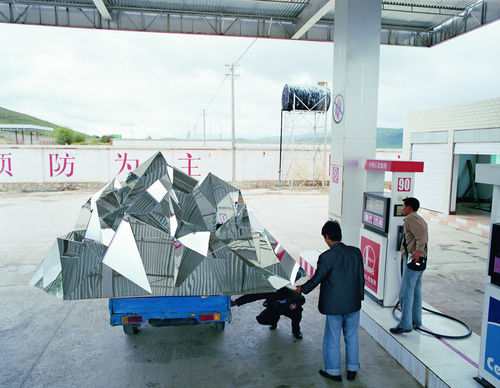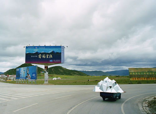 The installation centers on a video approximately thirty minutes in length, shot on location in Shangri-La. A number of other elements are in an adjacent gallery, primarily a large sculpture of a mirrored mountain mounted on a rotating platform. Chang describes this sculpture as “kind of a giant sacred mountain prayer wheel crossed with a disco ball.”