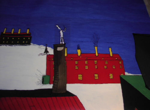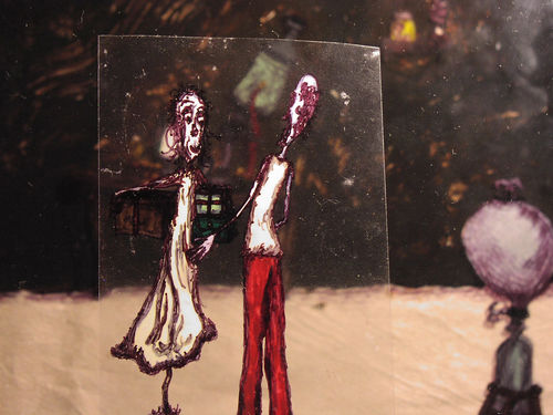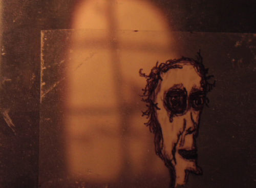 A short, dystopic tale, narrated by Green himself alongside live instrumentals by the band Califone, Hadacol Christmas depicts Mr. Claus as a poor, sickly Giacometti-like figure addicted to an over-the-counter cough syrup called Hadacol.2 Hadacol, we are told, "sponsored a lot of Hank Williams radio shows" and renders Santa Claus in a perpetual state of malaise. In a desperate, tremulous but urgent voice, Green recounts Santa's everyday existence, telling of his ailments, his trials, and the suite of come-to-life hallucinations that inhabit his ramshackle world. Despite his melancholy, Claus is still an industrious and productive man, tinkering away with "outlandish machinery, little trinkets, and baubles." In Green's rendition, Claus is not a hero or a Grinch, but more of an existential outsider artist gearing up for his raucous sleigh ride. Created with rough sketches, torn kraft paper, bits of transparencies, masking tape, and fluffy cotton balls, the scenes move nervously, from cel to cel, with brilliant material ebb and flow. One may conclude that Green probably cut this epic tale on his kitchen table, allowing lint, dust, sticks, and even a dental X-ray to sift into the piece. To break the illusion, cel numbers appear scribbled at the edges of the sheets of glass, which are sometimes layered to create blurriness or the fog of snow and murky weather. We are aware of how this entire world could just blow away. Califone's Appalachian-infused music sets the tone for Hadacol Christmas as if it hails from a bygone era—a deeply remote America with roots in beguiling oral histories and tall tales. This world—though more poetic and tentative than, say, Tim Burton's (it's closest aesthetic kin)—twinkles with frail hope and the strange sweetness of human pathos.