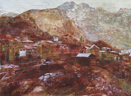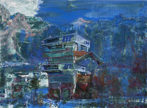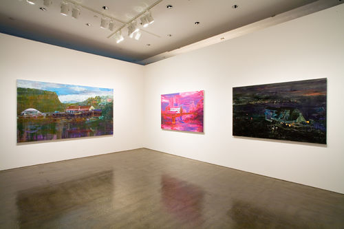 Angela Dufresne's large canvases depict imaginary landscapes populated by strange modernist structures. Dufresne's brushstrokes, painted with a loose, frenetic energy, add to the sense of alienation and anxiety her compositions produce, yet they also translate the forward-looking idealism espoused by modernist architects like Le Corbusier or Frank Lloyd Wright. She presents utopias gone awry in color schemes that range from vivid acidic hues to more natural earthy tones.