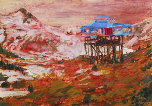 On another level, the painting depicts an example of social reversal, showing a castle transformed from a residence of the wealthy to a cooking school and a grouping of small buildings that once housed servants and now act as restaurants. Helped along by Dufresne's fine washes of paint, however, the scene can also be read as a two-dimensional landscape flattened up against the picture plane—a single wall of color and abstracted form. As such, the various horizontal elements work as strata of sky, earth, and roots (in which the "old way" of class becomes "buried" at the base of the canvas). They also imply a temporal passage: Dufresne essentially moves social organization forward in historical time while also thinking about it retrospectively (she first displaces class and then does away with it completely). Denying her role as a social critic, Dufresne instead advocates a reading of her work in terms of celebration and freedom. When a building is recouped—as the castle is in this painting and as all her buildings are—it takes on a new purpose, a new context, and, in the artist's words, "comes alive." Loosening reality from the bonds of reason and aligning it with the freedom of experience and imagination, Dufresne imbues it with profoundly new meaning—passionately, and sometimes convulsively, unleashing a new conception of the world.
