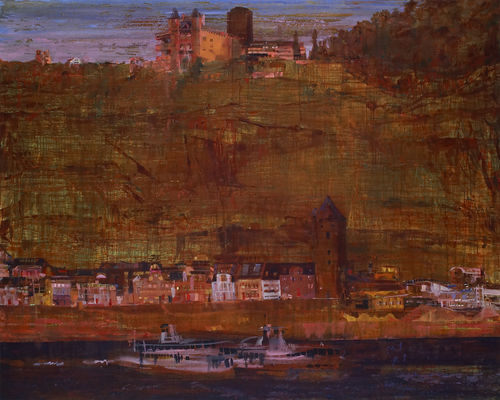In a similar rejection of narrative, Dufresne originally referred to her landscapes as "stills" but realized the inaccuracy of this term: "It's impossible. A painting is not a still because there's all this time that passes in the process of making it. . . . I revisit it at different times, so it goes through multiple interpretations."1 This sense of layering boasts timelessness and simultaneity, which first come through in her work by way of color. In The Rhine—The Culinary Row Academy and Conservatory Institute (2006), as in much of Dufresne's color-saturated work, the underlayer of paint shows through the secondary hues added to define objects. Citing Jan Vermeer's and Edouard Vuillard's modes of color mixing as an influence, Dufresne intentionally pushes the base color and additive layer together through thin strokes of paint (in this case, a mossy green and reddish brown, respectively; in other paintings, the colors are more at odds, such as oversaturated red and purple), at once permitting an atmosphere of transparency and a balanced thematic mood.