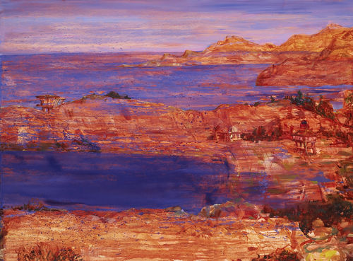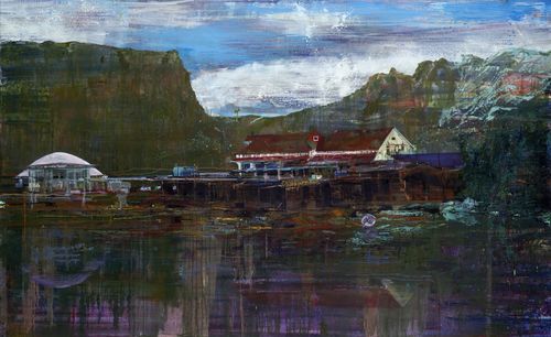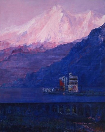 A prolific and versatile painter, Angela Dufresne produces large-scale landscapes that contain the collaged effect of rectilinear modernist buildings inserted into rough, time-swept landscapes—all rendered in a painterly collision of color. In this single breath, Dufresne rewrites the context of form and space, creating her own branches of history and infusing them with a Romantic mood and a sense of personal freedom.