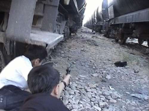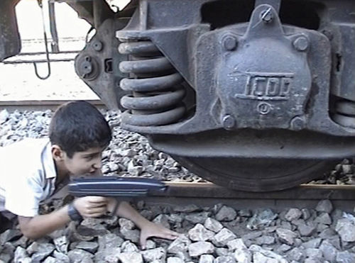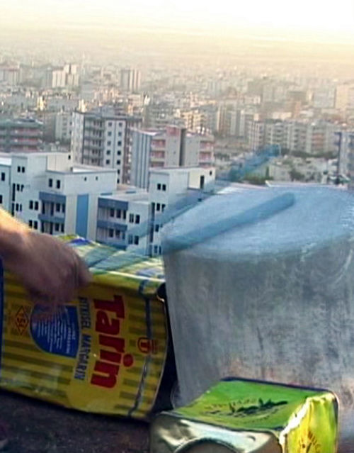 Atay left the question of intent open in Fast and Best and achieved the unexpected. Never engaging in the prototypical one-liner or succumbing to the charms of the fast and clever work or the inevitable documentary, Atay keeps his terms of play focused on cultural traditions with an emphasis on the childlike and the improbable. He does not play the role of the Kurdish artist, but the placedness of his works, and the dreamy diversity of his references, produces such a surplus that one does not quite know what to make of it. Bang!Bang! followed in late 2003. Shot with a wobbly camera in the style of live war coverage or cop TV, the video shows kids playing war games in a railway depot, running around train cars, ducking under rails. The gunfire sounds that the boys emulate—and they are no strangers to these sounds—fill the air. The memory of trauma is all too present, making the sublimation all the more powerful, and these are the very trains that carry oil out from Batman and that take its soldiers to the city. The title is an allusion to Nancy Sinatra’s song “Bang, Bang (My Baby Shot Me Down).”